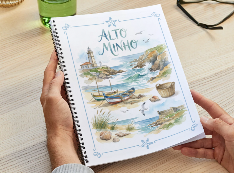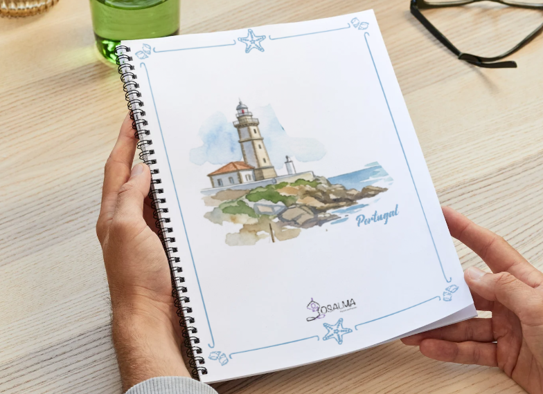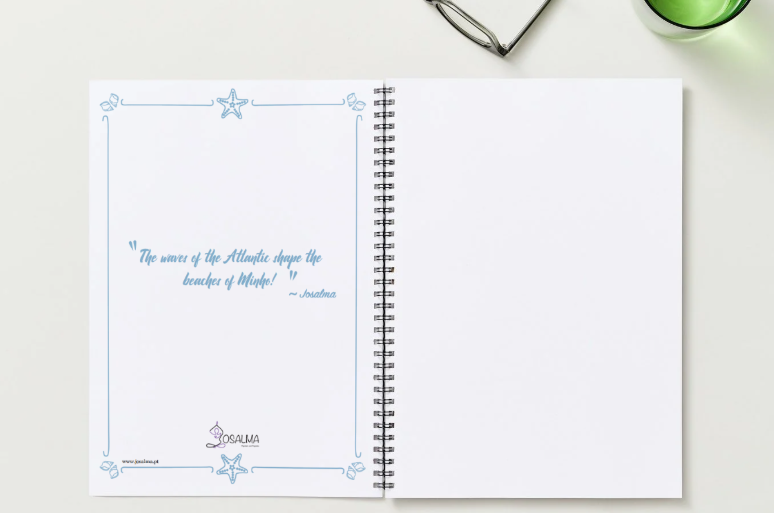 The Alto Minho Notebook from Josalma's collection pays tribute to the coastal beauty and Minho's traditions. Its cover features delicate illustrations of lighthouses, boats, seashells, and seaside elements, capturing the essence of the ocean and local culture. Perfect for those who value authenticity and inspiration, this notebook is ideal for notes, journals, or creative projects. With practical spiral binding for added convenience, it invites you to write freely and immerse yourself in the landscapes of northern Portugal.