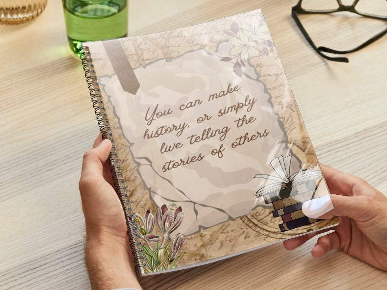 Discover the Josalma Library Notebook, designed for those who cherish stories and knowledge. Its elegant cover features warm tones, floral details, and a stack of books, paired with the inspiring quote: You can make history, or simply live telling the stories of others. Perfect for notes, reflections, or literary projects, this notebook is ideal for writers, students, and book lovers. With practical spiral binding for added comfort, it's the perfect companion to turn ideas into words.