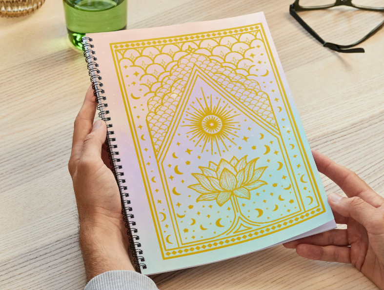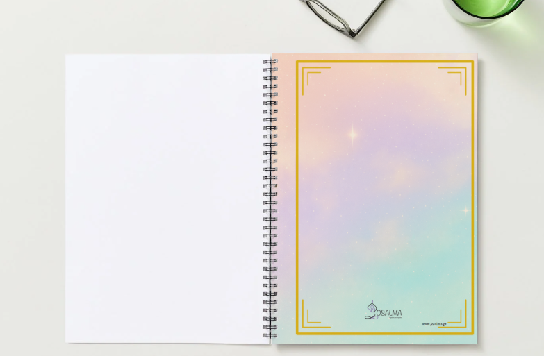 Experience the serenity of the Josalma Lotus Notebook, designed for those who seek inspiration and balance. Its elegant cover features soft pastel tones and golden details, showcasing a lotus flower and celestial symbols that evoke inner peace and spirituality. Perfect for notes, reflections, or mindfulness practices, this notebook invites you to turn thoughts into harmony. With practical spiral binding for added comfort, it's the essential accessory for writing with purpose and beauty.