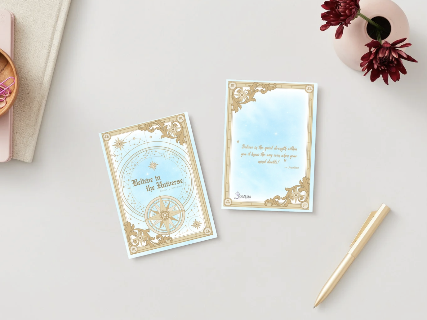 The Universe Notebook by Josalma is born from the perfect balance between functionality and enchantment. Ringless and thoughtfully designed, it is inspired by the vintage magic of the universe, inviting free writing, reflection, and limitless creativity. Every detail echoes the mystery of the stars and the timeless beauty of the cosmos, making it the ideal companion for those who appreciate objects with soul. Perfect for notes, journaling, or ideas that need space to grow, Universe is more than a notebook — it is an invitation to slow down, imagine, and create.